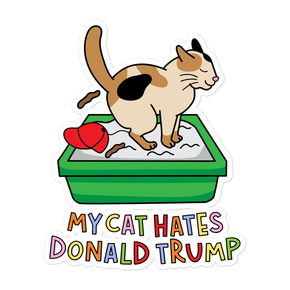 Proof that even the cat’s had enough. This 5.5" x 5.5" durable vinyl sticker is equal parts cute and cutting, featuring feline-level disdain for all things Trump. Weatherproof, fade-resistant, and perfect for laptops, water bottles, or right above the litter box — where all the crap belongs.