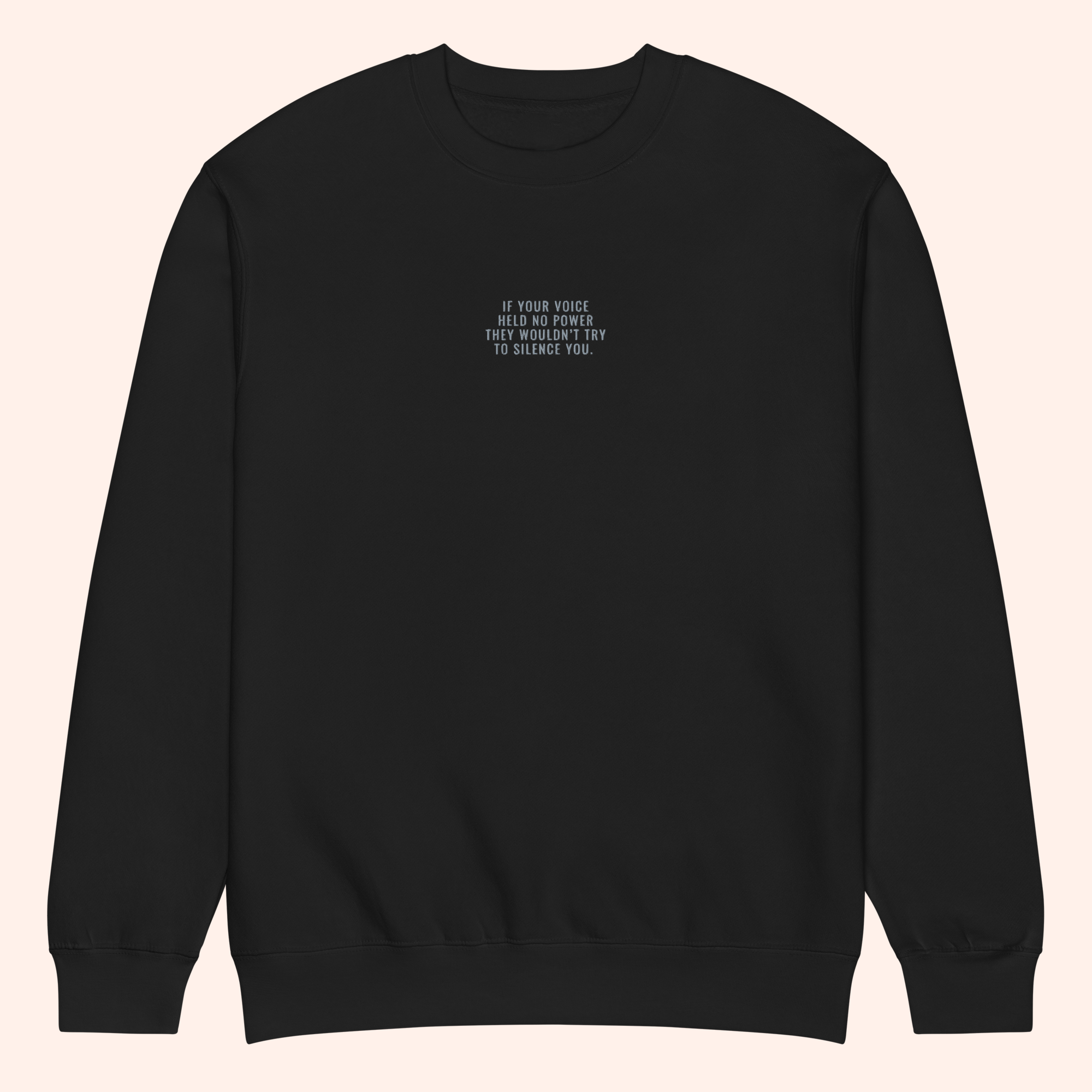 Power stitched in subtlety. This limited-edition crew neck carries a small embroidered reminder that your voice matters—so much that those in power try to quiet it. Minimalist in look, but bold in meaning, it’s protest wear disguised as everyday style.