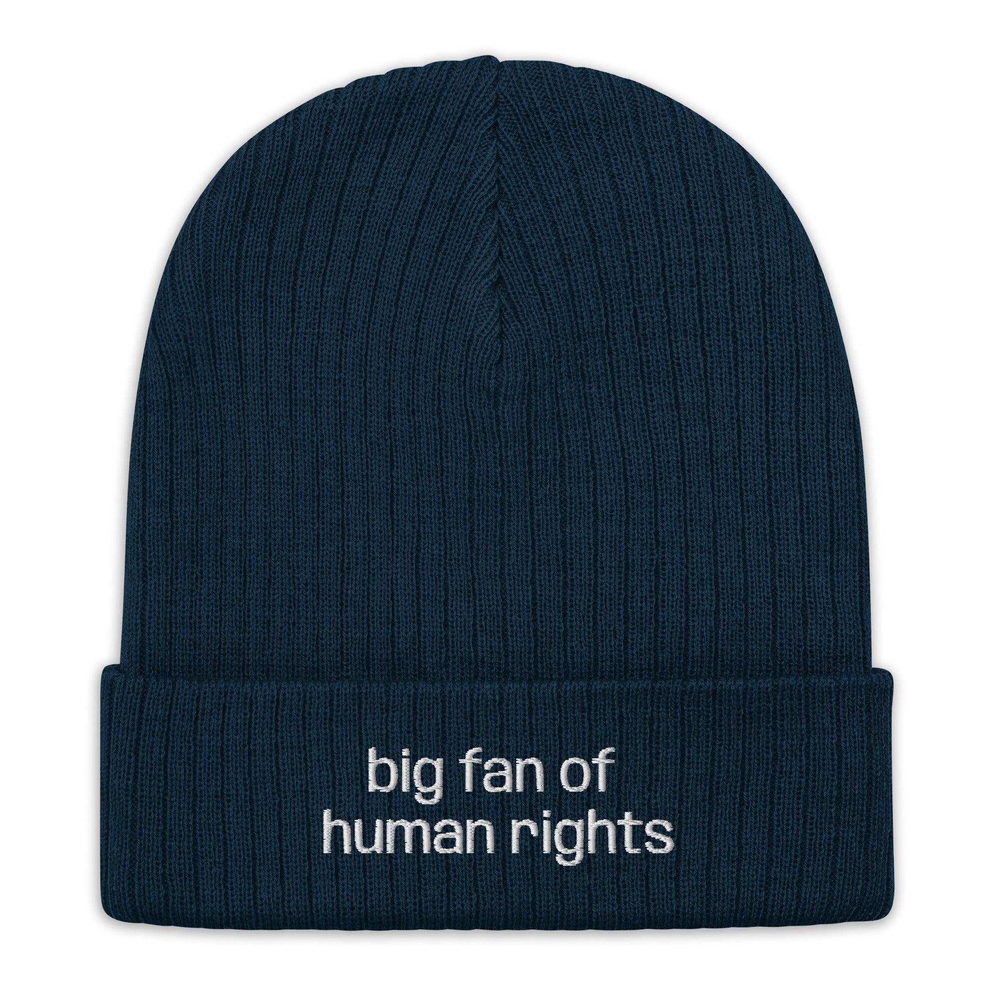 Stay warm and stay vocal. This cuffed ribbed knit beanie is embroidered with Big Fan of Human Rights—a statement that’s as true in winter as it is year-round. Made with 50% recycled polyester and 50% acrylic, it’s soft, durable, and designed to keep its shape wear after wear.