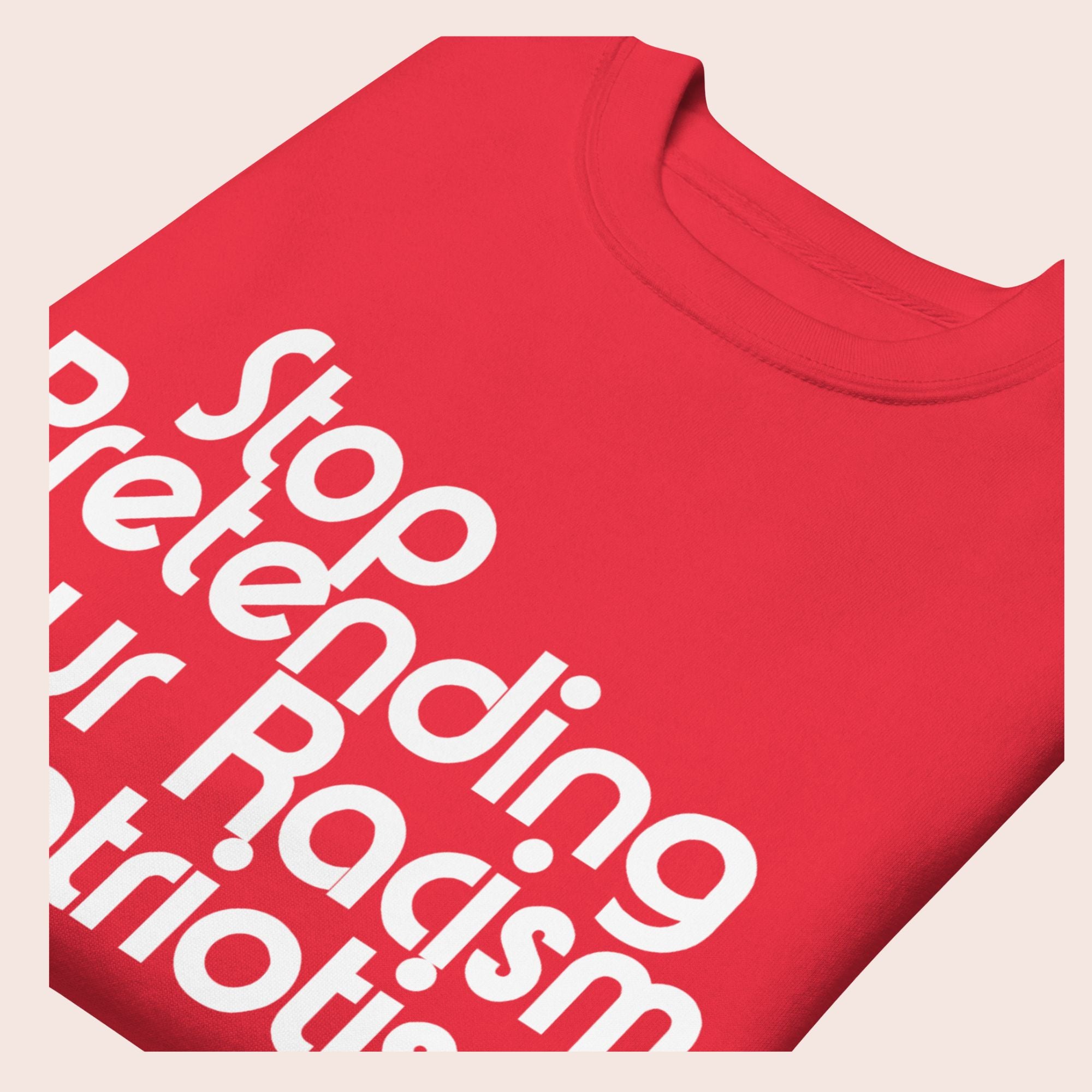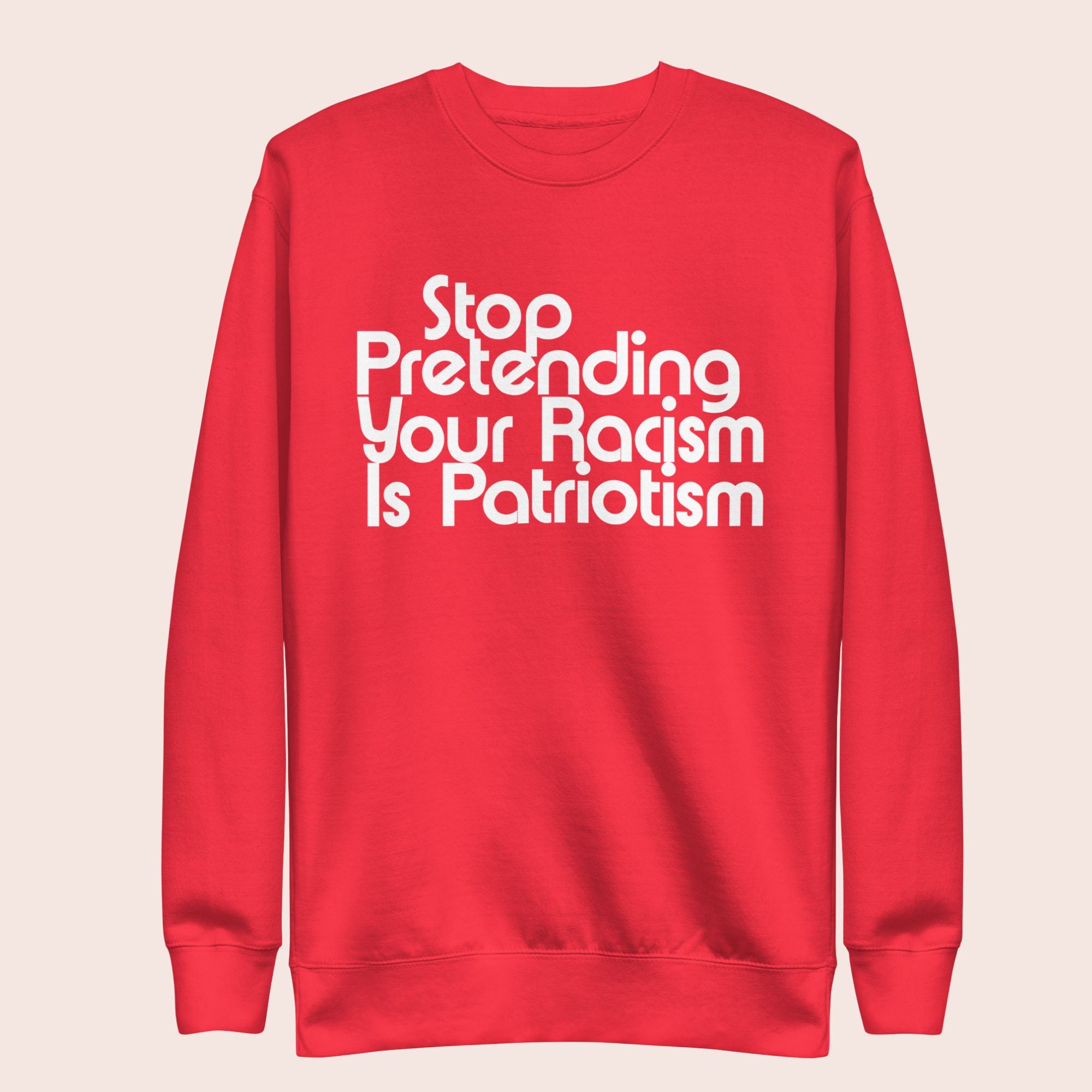 The Stop Pretending Your Racism is Patriotism sweatshirt pairs a classic streetwear fit with a call for truth.