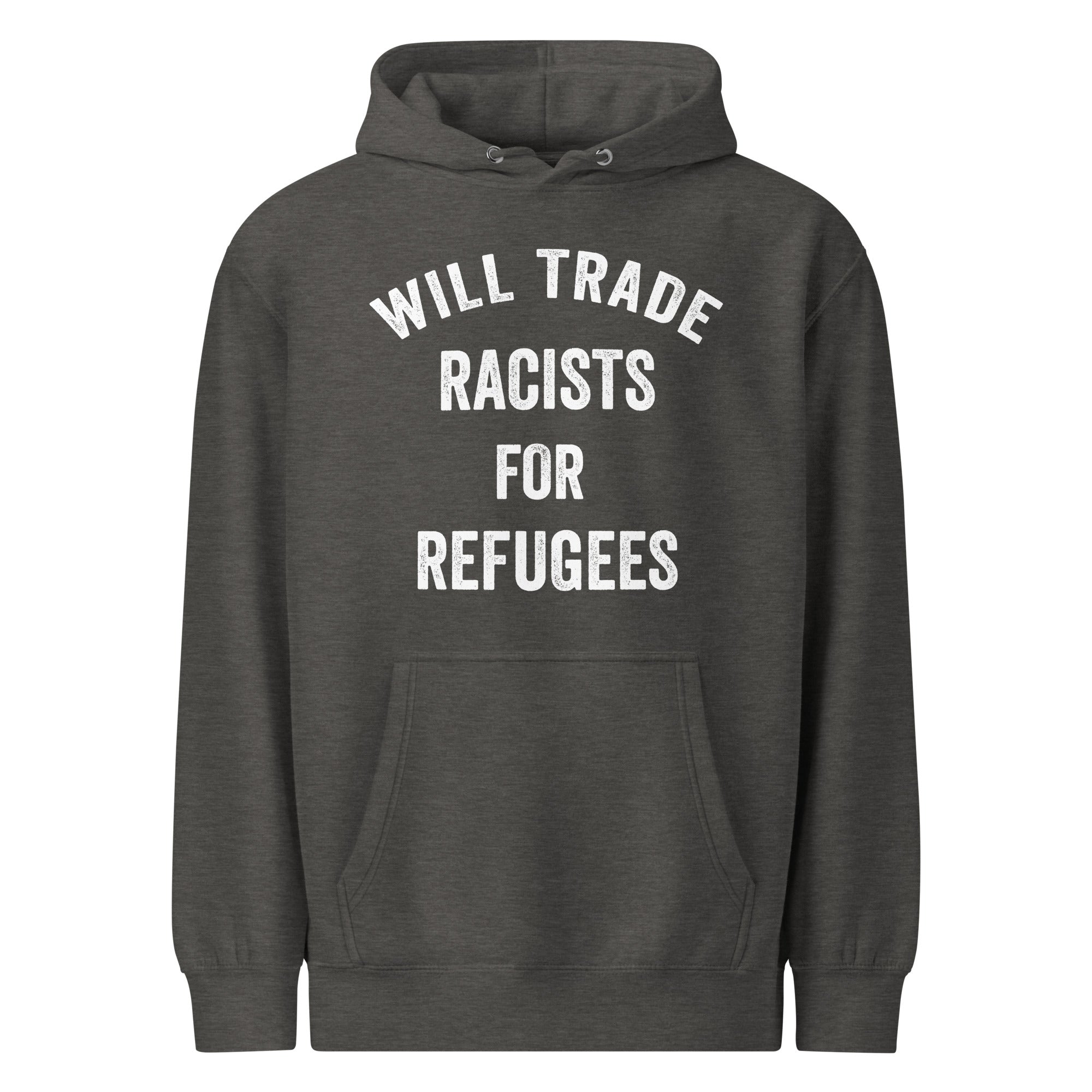 Buttery soft on the outside and lined with cozy fleece, this premium mid-weight hoodie is all comfort with a sharp edge. Featuring Will Trade Racists for Refugees across the front, it’s protest gear that doubles as your coziest staple. Relaxed, durable, and made for layering, it’s the hoodie you’ll want on for fall nights, weekend errands, or long days of organizing.
