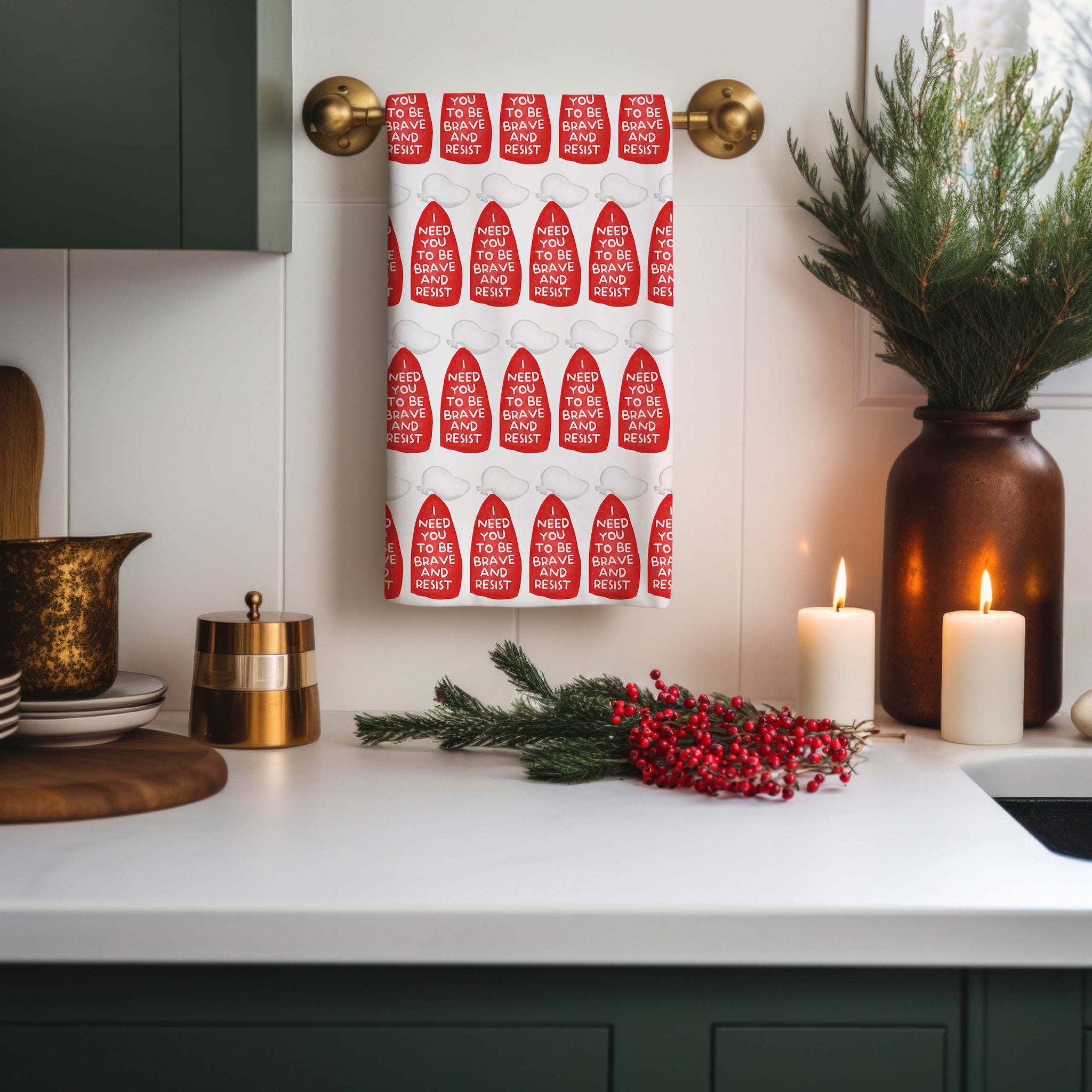 Add a powerful reminder to your space with this soft + absorbent hand towel. “Be Brave and Resist” — a message for anyone refusing to stay quiet, comply, or shrink back in the face of injustice. A bold statement piece for your bathroom, kitchen or guest bath — especially during election season.