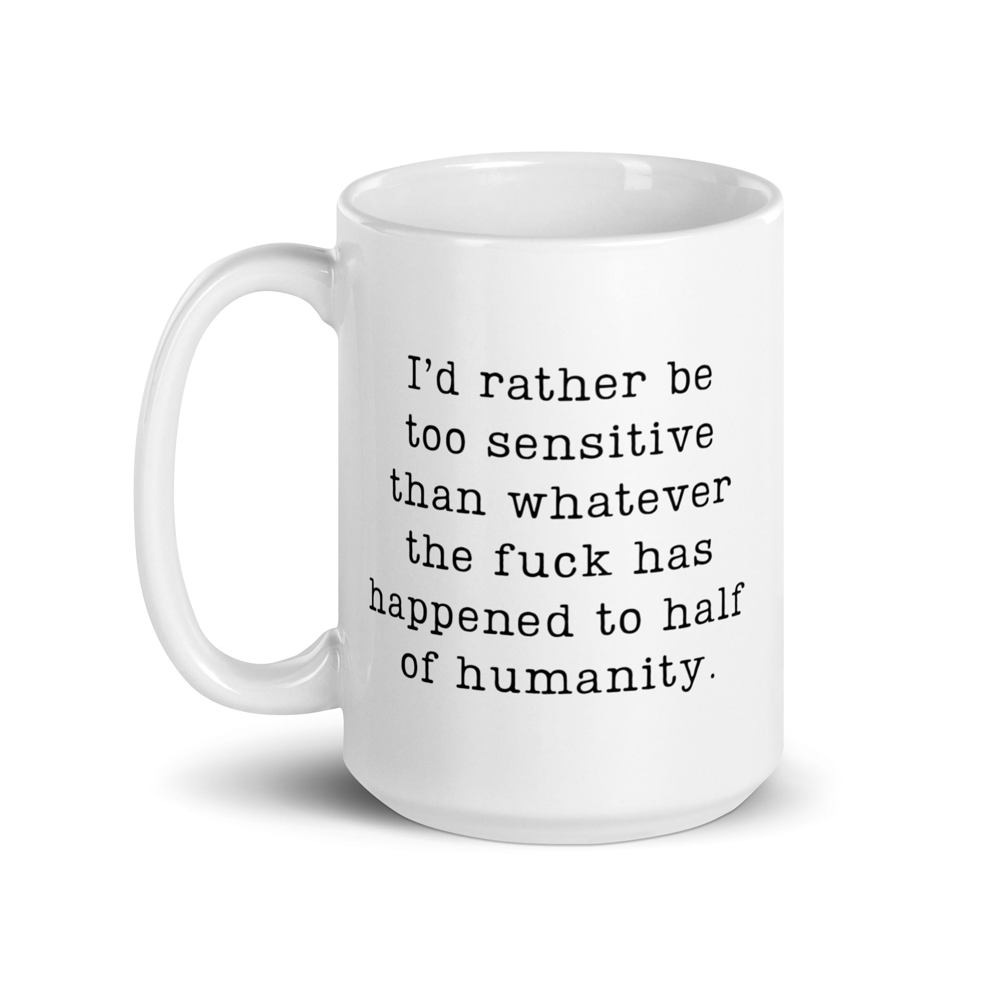 This 15oz mug says what we’re all thinking: “I’d rather be too sensitive than whatever the fuck has happened to half of humanity.” Perfect for sipping your coffee while silently judging society’s collective loss of empathy.