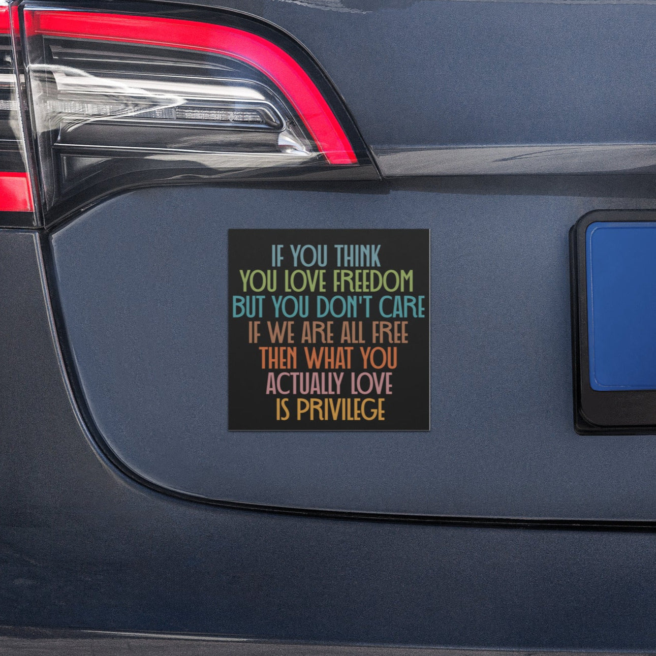 If you think you love freedom but don’t care if we are all free, then what you really love is privilege. This magnet is a bold reminder that freedom isn’t selective—it only matters if it’s for everyone. Built strong and weather-resistant, it’s made to last through every drive, rally, and season of change.